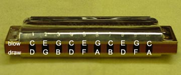 The reed plates are sandwiched between the cover plates and the comb. In a standard diatonic harmonica, there are two reeds for each hole-- one used on draw notes and the other on blow notes. The pitch and resultant scale of the harmonica is directly related to two factors; the material that the reeds are made of and the length of the reed. Metal is the most common material used for reeds in instrument quality harmonicas. The length of the reed determines the pitch; that is, the longer the reed, the deeper the pitch.
